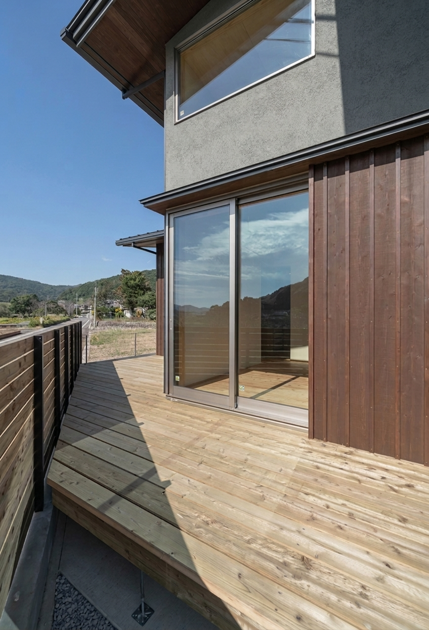 ウッドデッキと風景が調和する家