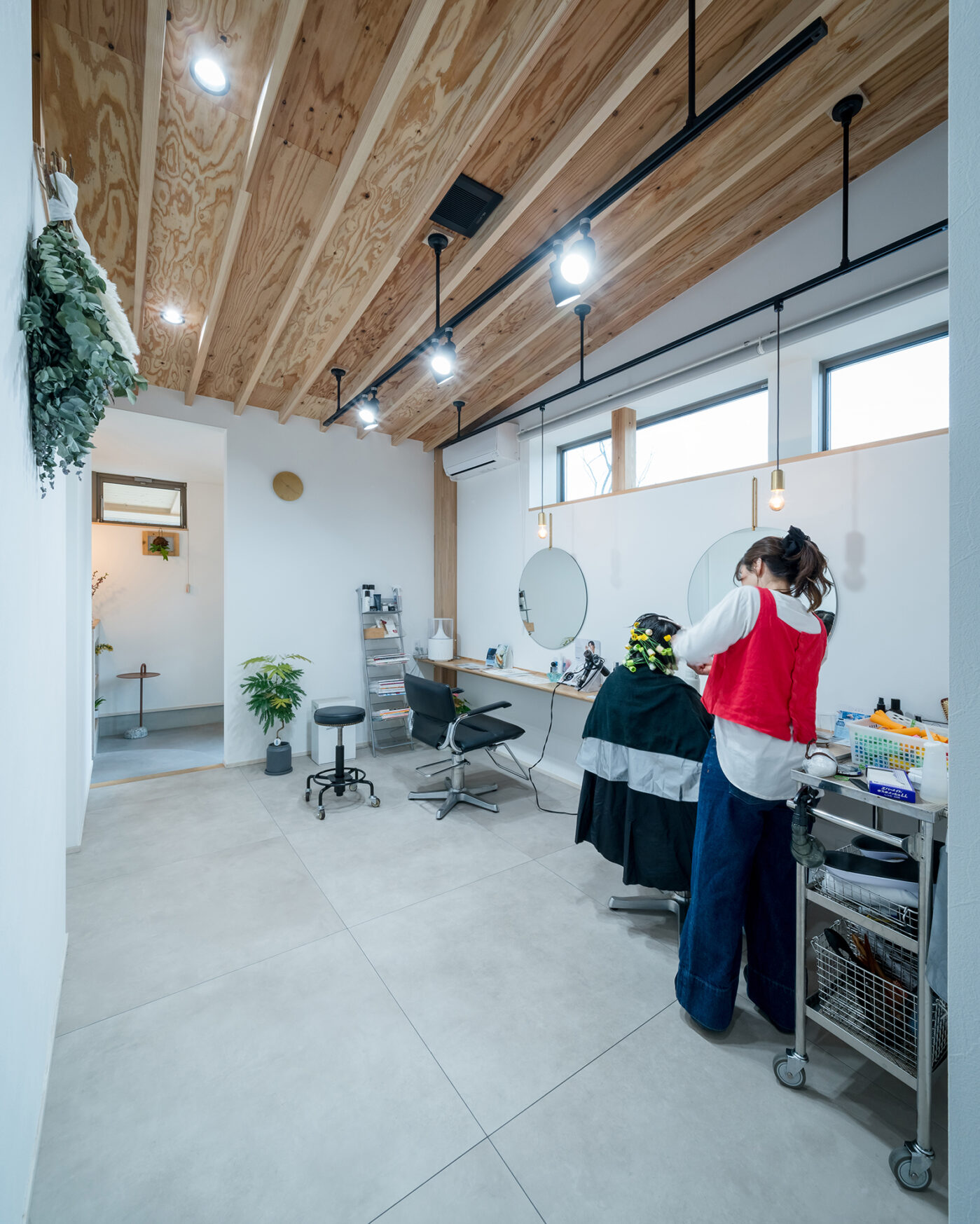 光あふれる店舗に、木の天井が温かみをプラス