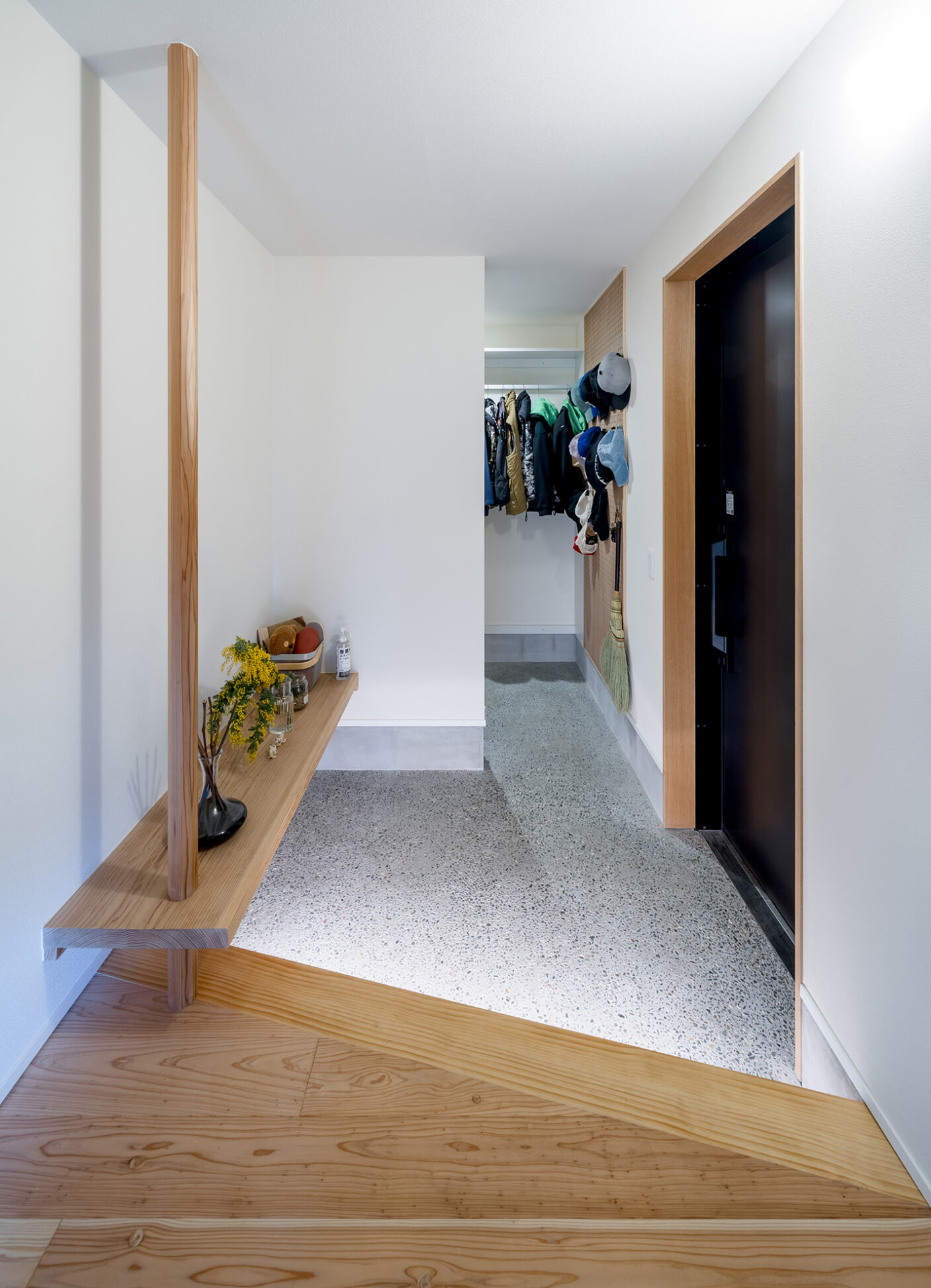 住居側の玄関には、容量たっぷりのシューズインクローゼットを設置。