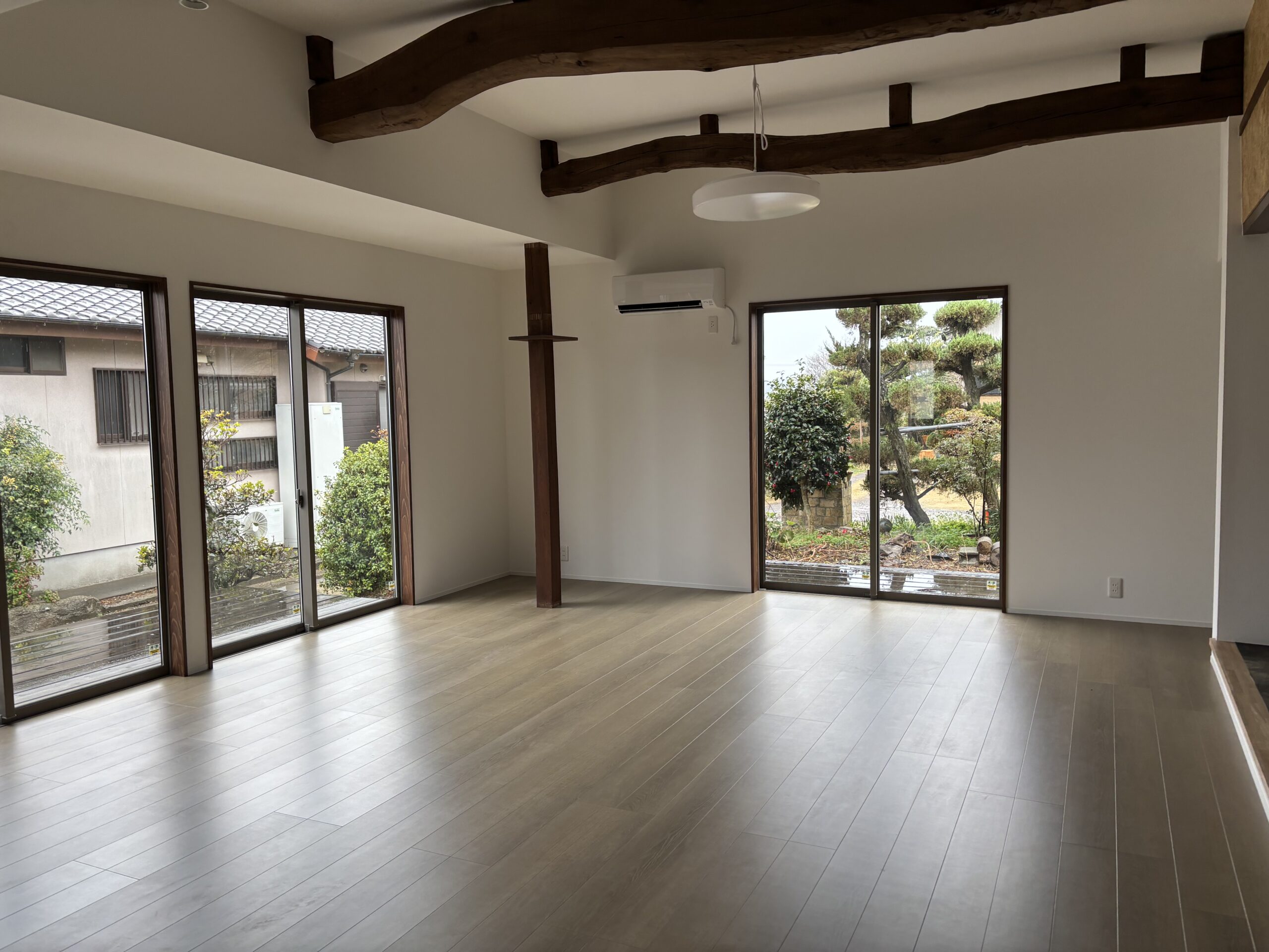 【after】 解体した時に出てきた立派な梁をそのまま生かしたリビング。新しいけれど、どこか懐かしく落ち着きのある、そんな空間に仕上がりました。